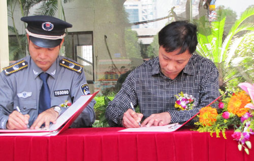 隨后,共建單位雙方代表中山市金馬科技娛樂設(shè)備有限公司董事長(zhǎng)、總經(jīng)理鄧志毅先生,中山市城市管理行政執(zhí)法局石岐分局蘇響全局長(zhǎng)分別在共建協(xié)議書上簽字。