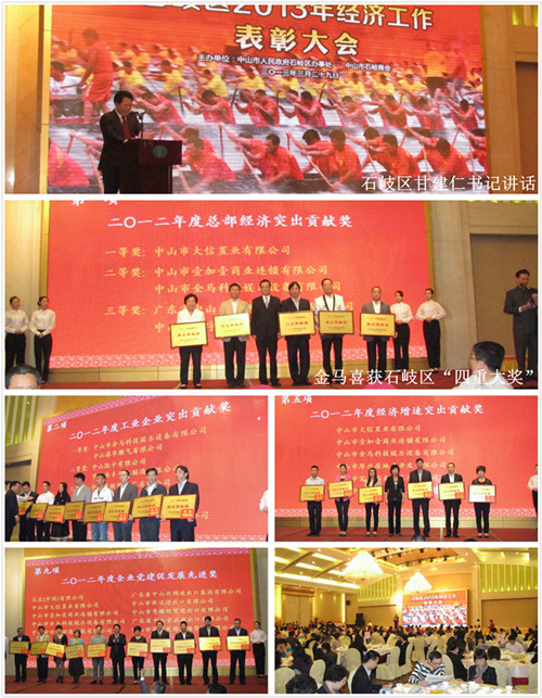 2013年3月29日中午,中山市人民政府石岐區(qū)辦事處舉辦了2013年度經(jīng)濟(jì)工作表彰茶話會(huì),在過去一年里,金馬積極加快轉(zhuǎn)型升級(jí)的步伐,各項(xiàng)工作取得了突破性的發(fā)展,在大會(huì)上喜獲石岐區(qū)經(jīng)濟(jì)工作“四重大獎(jiǎng)”。