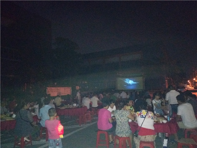 19:00,隨著夜幕降臨,本次活動的重頭戲也即將開始:戶外觀影《戰(zhàn)狼2》。在一旁的放映工作人員搭建好放映幕布、調(diào)試好放映燈光等設(shè)備后,一束射燈穿透黑暗,電影正式開始。前一秒還在熱烈交談、縱享美食的座上賓們頓時(shí)安靜了下來,目光不約而同地投向了大屏幕;一旁的小孩也不再繼續(xù)搗騰手中的燈籠,而是提著小燈籠歡快地跑到幕布最前方,如圖平日上課般安靜且認(rèn)真地融入了這片視覺與聽覺齊體驗(yàn)的氛圍中。