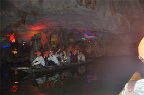 鏡頭一:賞過風(fēng)景如畫的鼎湖山,我們來到了盛名遠(yuǎn)傳的七星巖。七座形態(tài)各異的山峰,八個(gè)壯觀非凡的巖洞,移步換景之間,我們都不由得驚嘆于這里的每一處神秘。小艇輕游在龍巖洞的腹中暗河上,裹身于石壁鐫刻與溶洞奇景,頗有世外桃源之境。