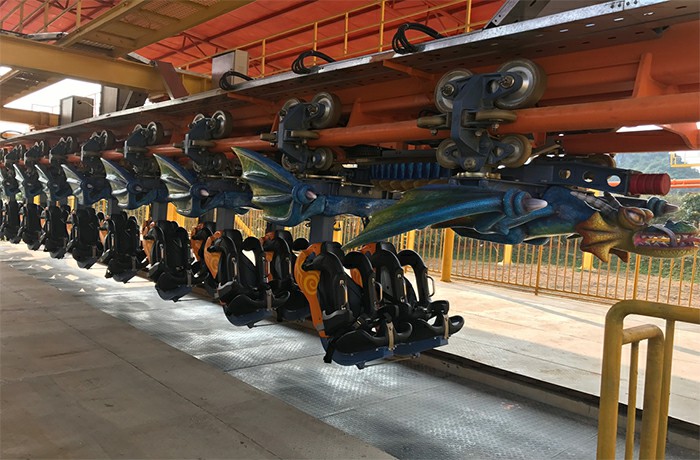 懸掛過山車的列車座椅懸掛于軌道下方,乘客懸空而坐,增加體驗刺激度。列車經(jīng)由動力提升到軌道最高端后,轉(zhuǎn)為沿軌道自由高速滑行,乘客坐于座椅上時盡情地享受失重、倒轉(zhuǎn)和離心的強烈感覺。列車外觀可根據(jù)樂園特色定制,幫助樂園打造專屬特色。