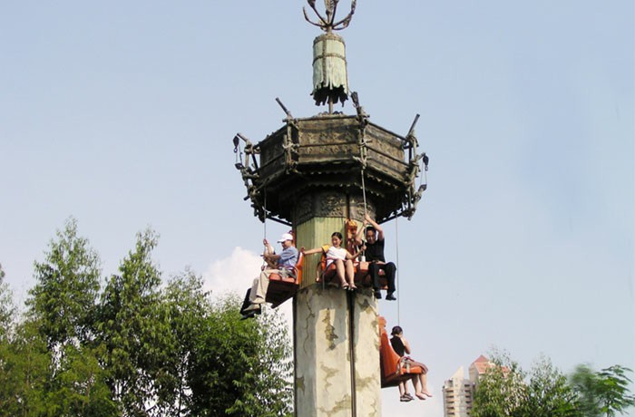 在乘客拉繩操作下快速升、降或停留在半空;快速上升時(shí),因要雙手交替拉繩,使人產(chǎn)生一種攀爬向上的感覺(jué);快速下降時(shí)又有高處下落的刺激;老、少咸宜。