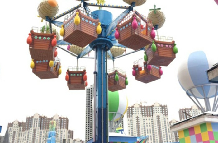 集旋轉(zhuǎn)、升降運(yùn)動(dòng)形式于一體的自控飛機(jī)類游藝機(jī)。逍遙塔是一款適合家庭游玩的游樂設(shè)備。設(shè)備啟動(dòng)后,座艙在升降運(yùn)動(dòng)的同時(shí)繞立柱中心軸旋轉(zhuǎn),同時(shí)座艙還可以自由旋轉(zhuǎn),運(yùn)動(dòng)過程乘客可以體驗(yàn)到乘坐游玩的樂趣。
