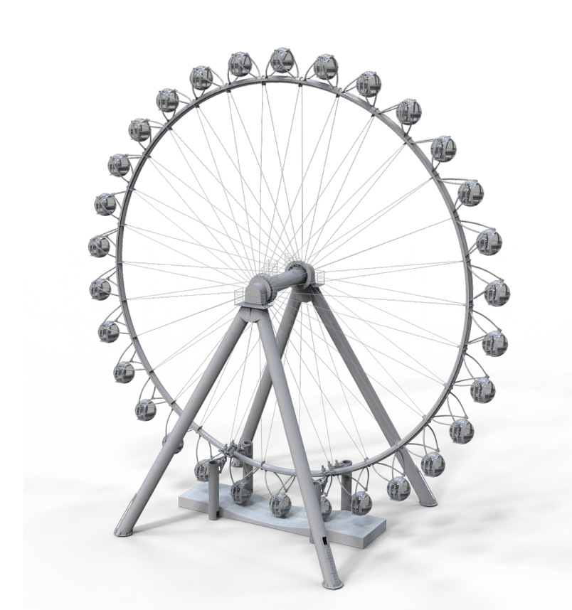 觀覽?塔架采?新穎的4?柱?橫梁極簡結(jié)構(gòu),搭配單管輻條式轉(zhuǎn)盤和圓球艙,整體姿態(tài)盡顯現(xiàn)代簡約之美。觀覽??轉(zhuǎn)盤上均勻分布著30個?珠般的圓球吊廂,單管輻條式設(shè)計令艙內(nèi)觀景視野開闊通透,可供180?觀光。在夜間滿環(huán)律動的燈光能瞬間點燃夜場?氛推?觀覽激情。